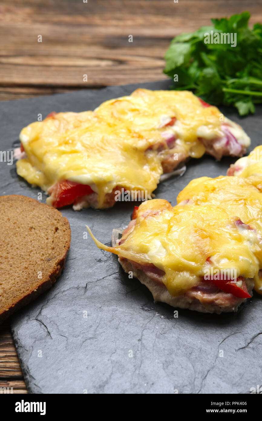 In Backofen Fleisch Mit Champignons Tomate Und Kase Uberbacken Servet Auf Stein Platte Stockfotografie Alamy