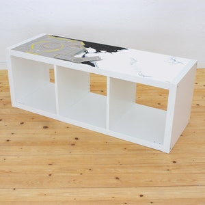 Die länglichen KALLAX Regale. Spartanisch ist für Kinder zu Recht ein Fremdwort. Um diese KALLAX Idee auch in eurem Kinderzimmer zu integrieren legt ihr das Regal einfach quer auf den Boden und befestigt 2 Platten mit Möbelschanieren an der Oberfläche.